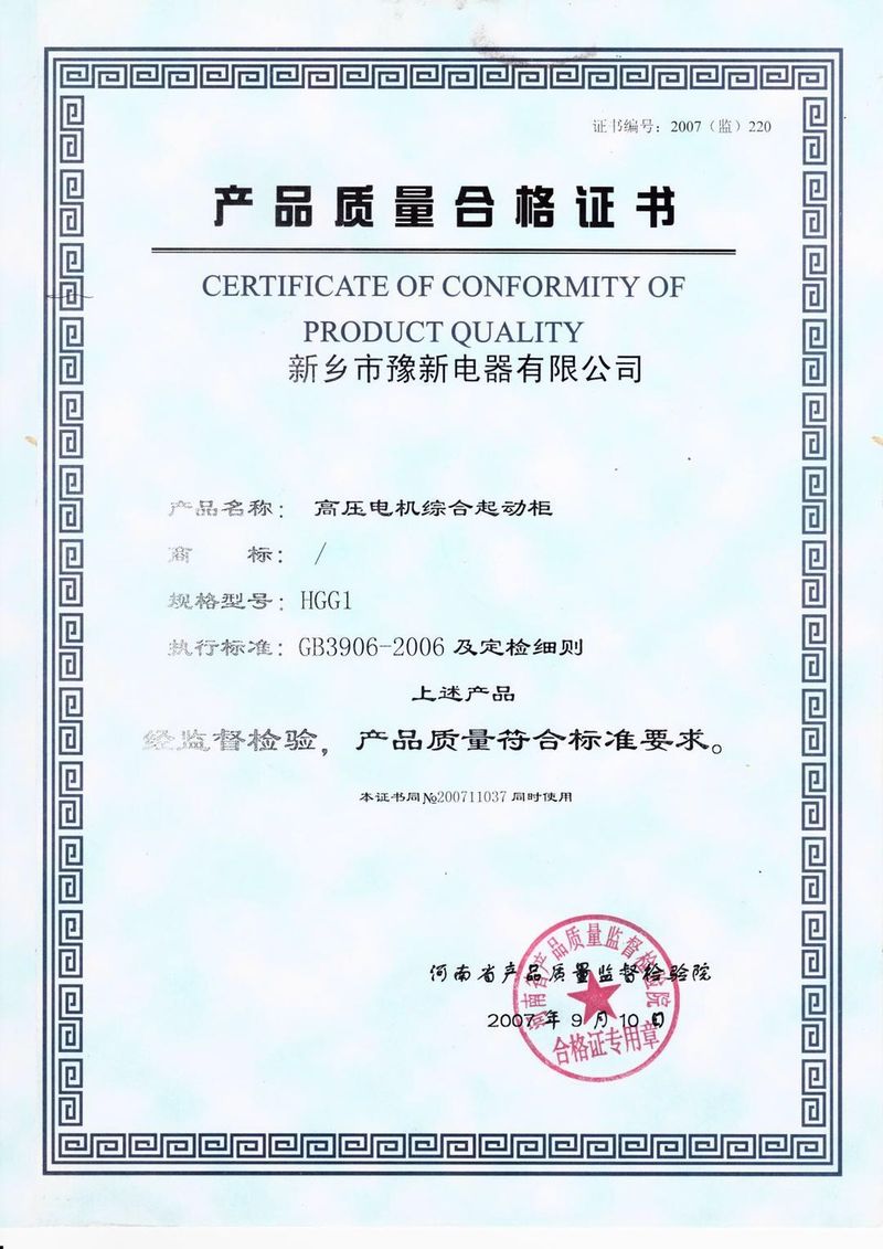 企業(yè)有高新科技人員,為新鄉(xiāng)市電機(jī)啟動(dòng)柜研究中心,GG1A型﹑KYN28-10KV高壓配電柜、高壓液體啟動(dòng)柜曾獲國(guó)家適用新型專利,專利號(hào)ZL2006200324849